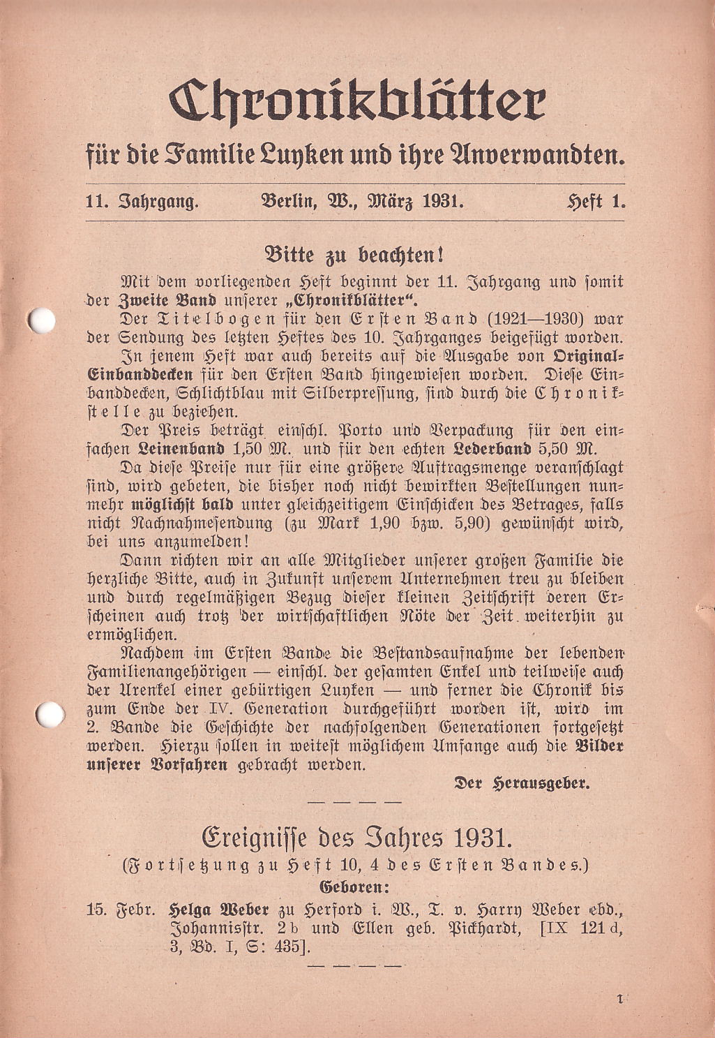 Chronikblätter 11. Jahrgang. Berlin, W., März 1931. Heft 1. Bitte zu beachten!